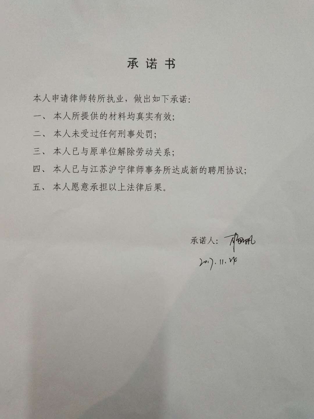 杨帆律师转所(市内)申请承诺书
