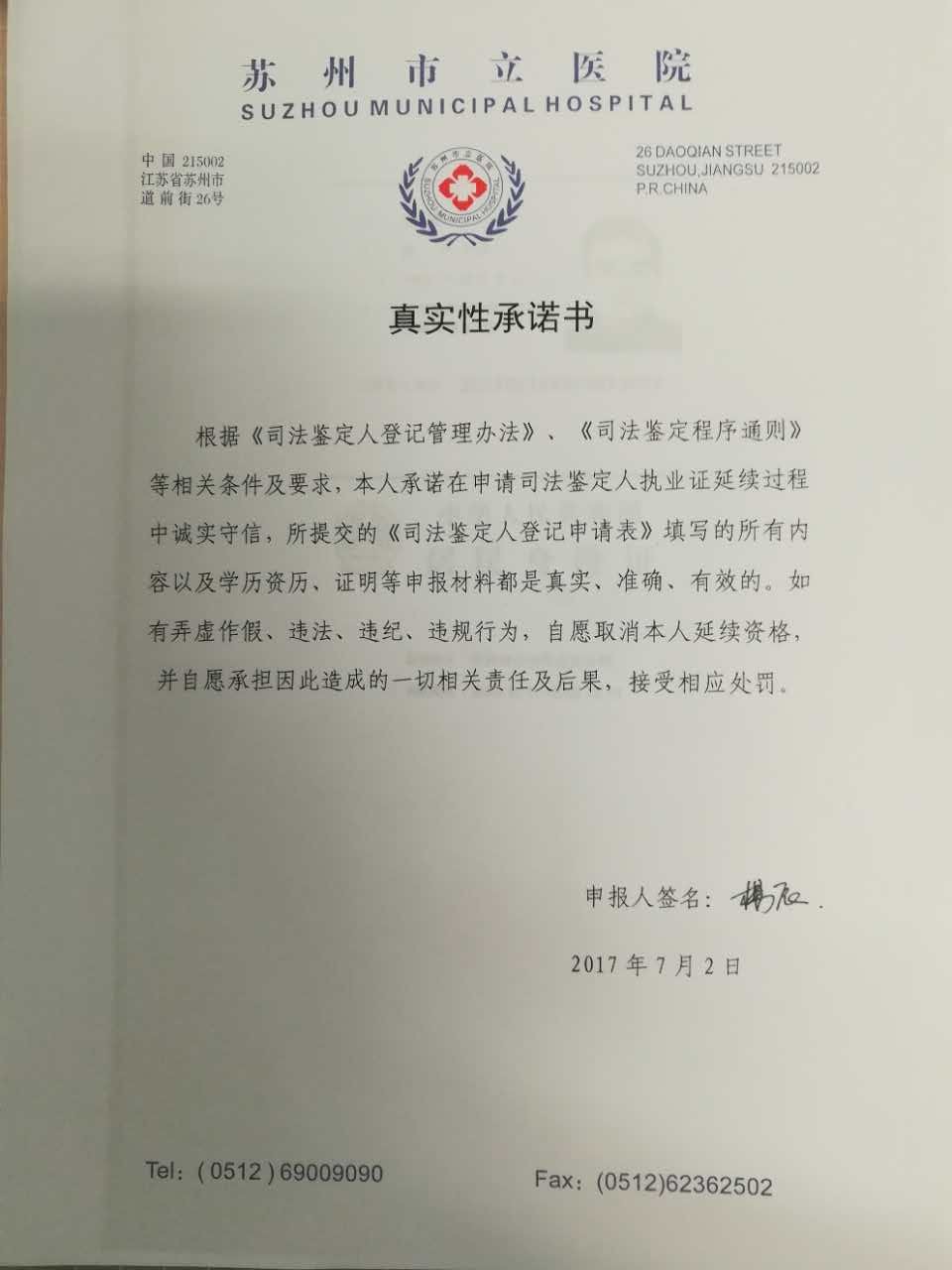 杨辰《司法鉴定人执业证》延续审核承诺书