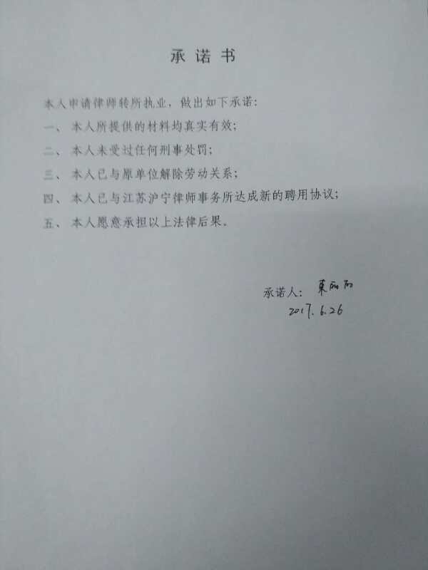 束丽丽律师转所(市内)申请承诺书