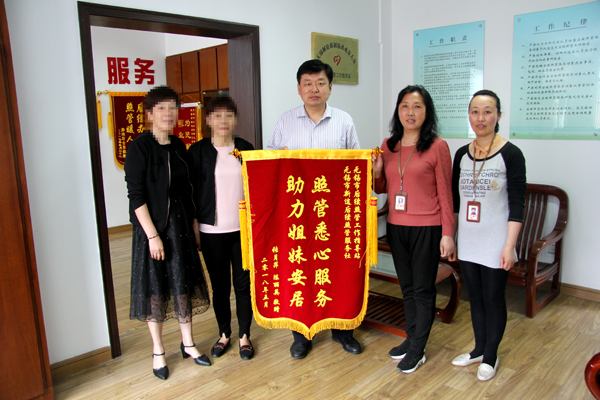 5月7日,后续照管对象陈某和张某为无锡后续照管站送去锦旗“照管悉心服务,助力姐妹安居”,感谢该站为他们解决实际住房和生活困难。