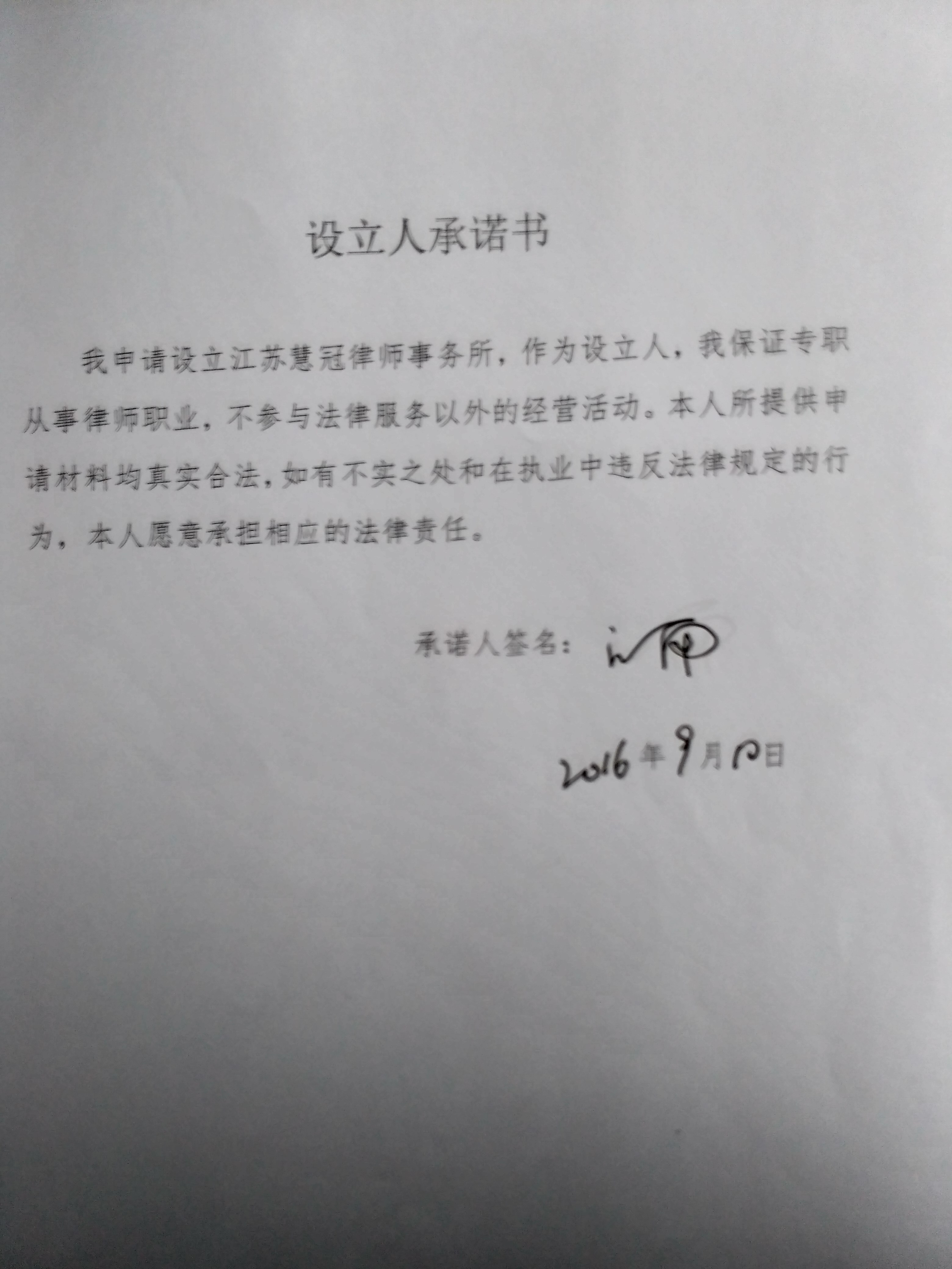 江苏慧冠律师事务所设立人承诺书(2)