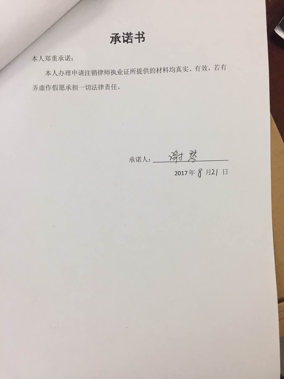 谢琴律师执业证书注销审核承诺书
